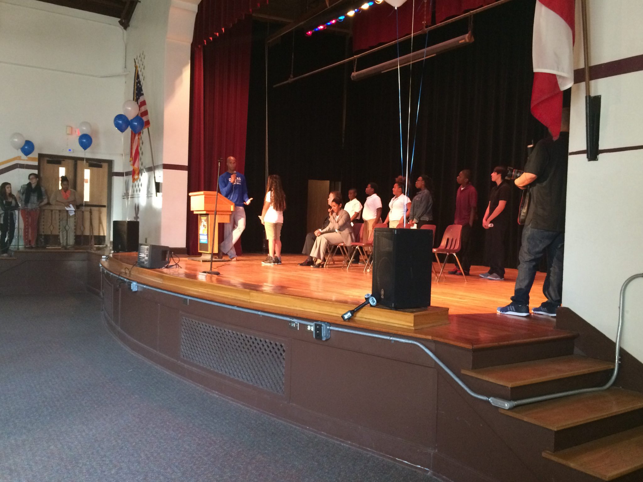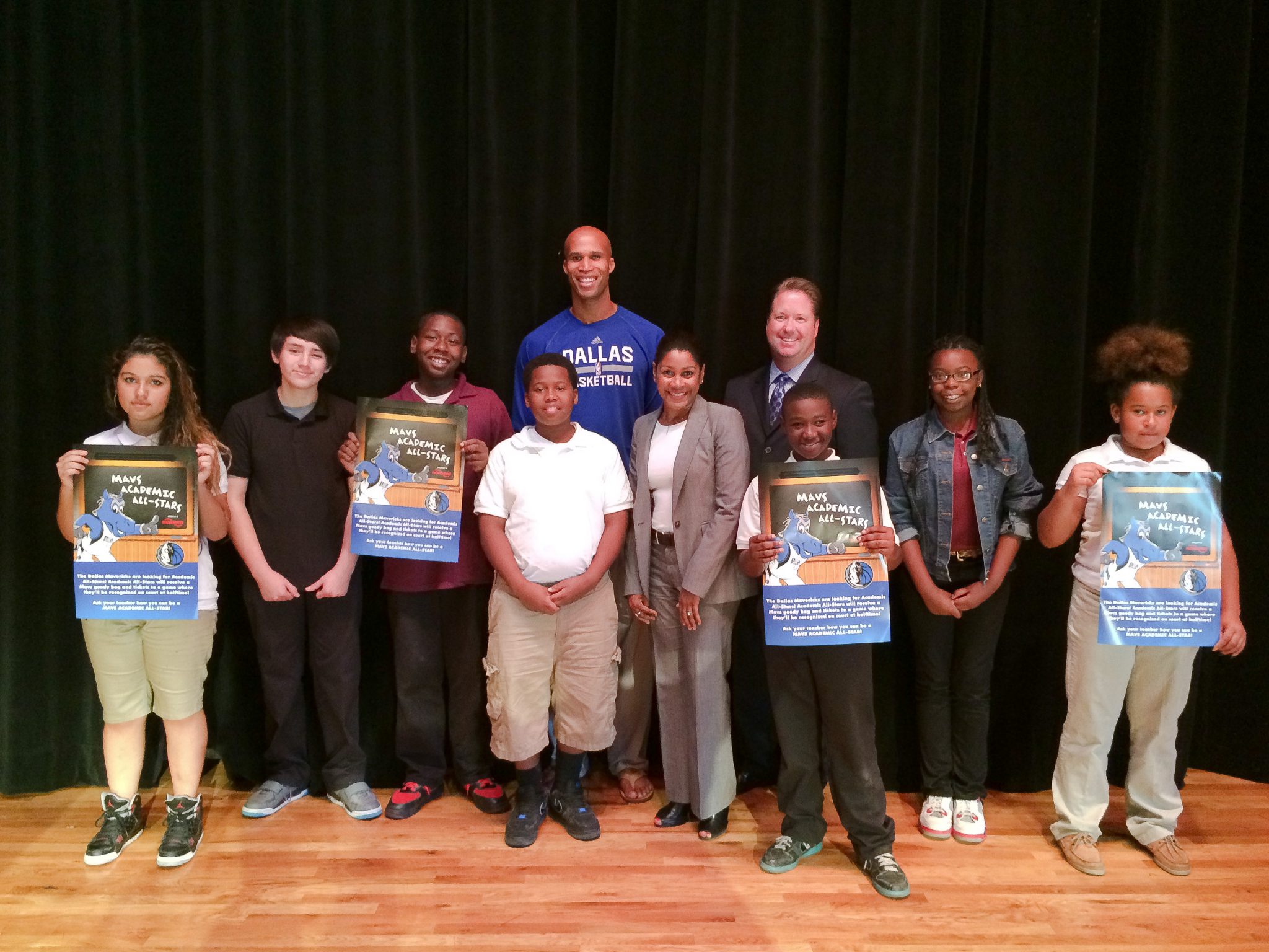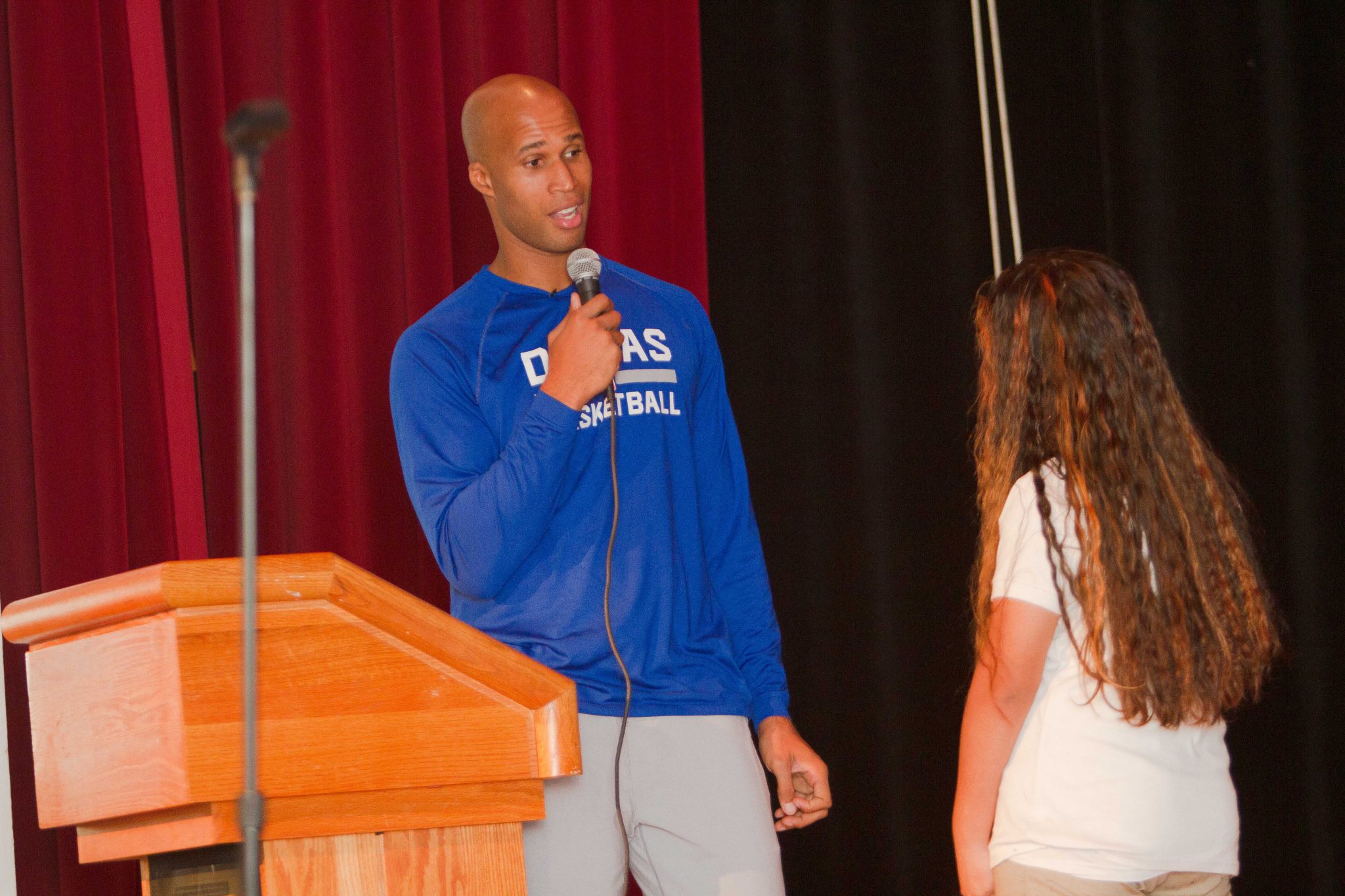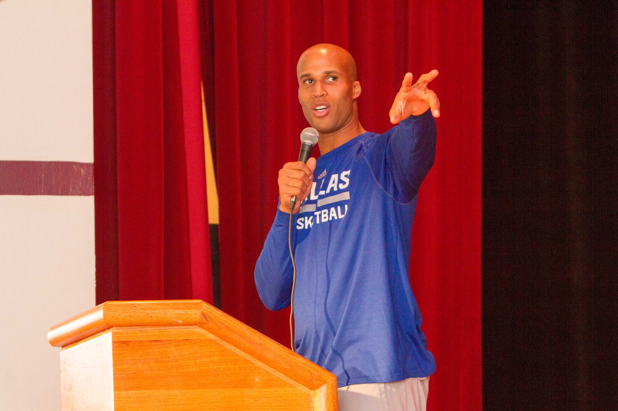 Mavs forward Richard Jefferson speaks to students in an assembly on Oct. 21 at Boude Storey Middle School. He encouraged students about the importance of an education and shared tips on reading and studying.