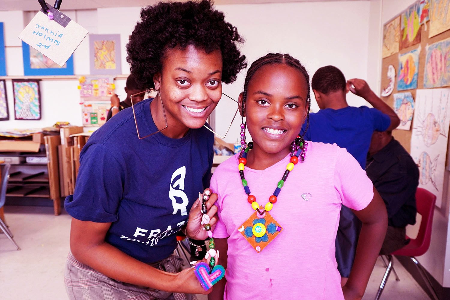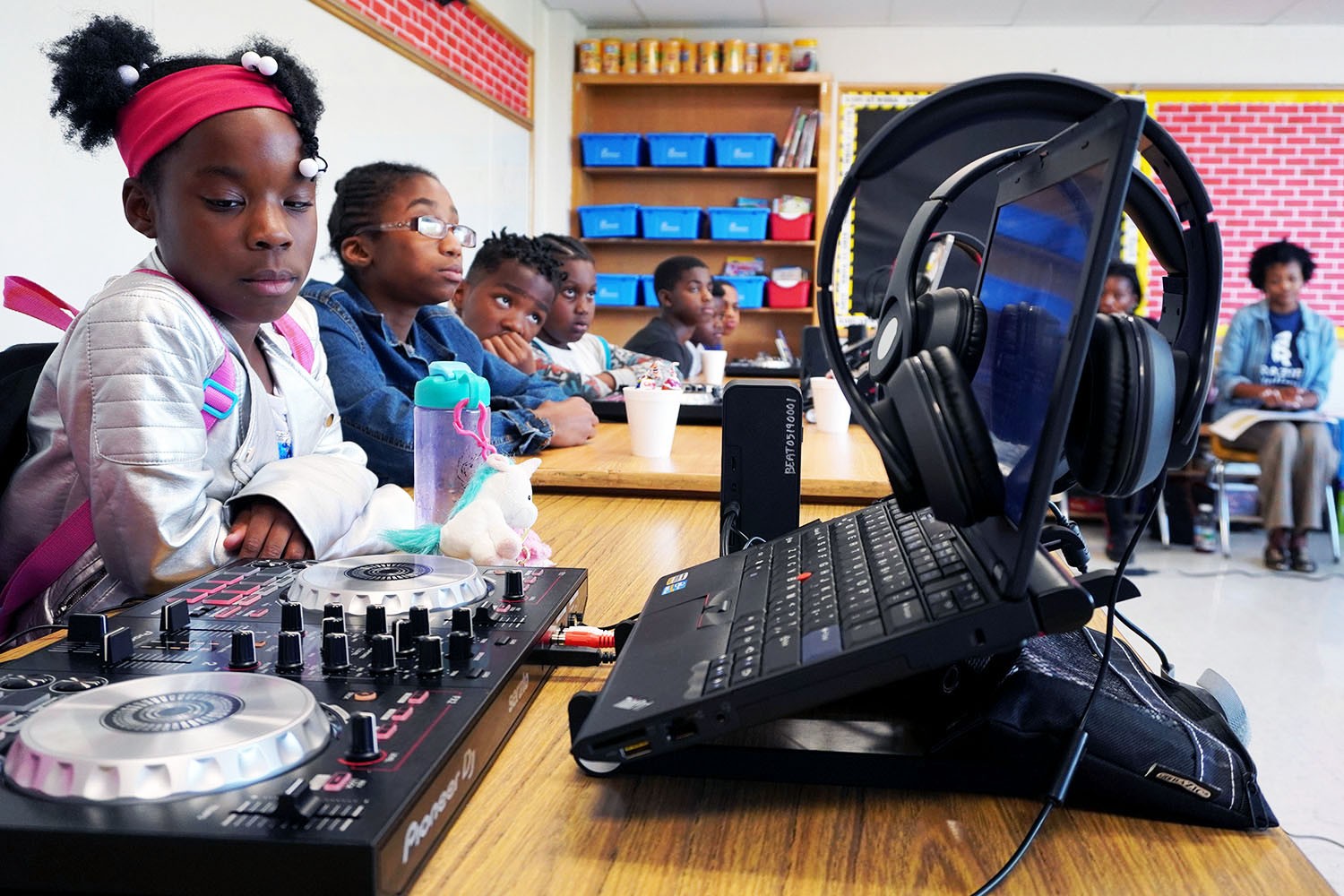 During music class, the second- and third-grade students beat buckets with drum-sticks to the rhythm of the Cha-Cha Slide. And the fourth- and fifth-graders made their own jewelry with beads during an “Art That You Wear” workshop.