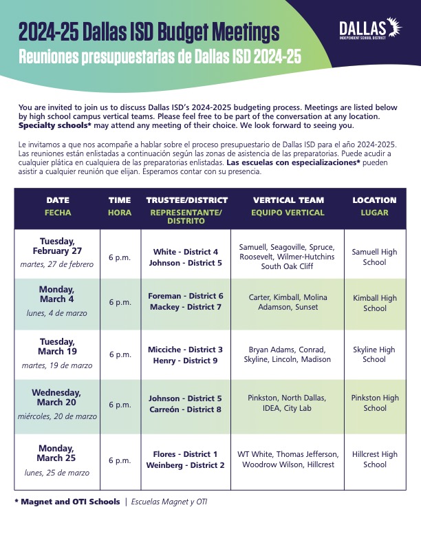 Dallas ISD to host an upcoming 2024-2025 budget meeting. This is the public’s opportunity to provide feedback and ask questions on the proposed budget for next school year.