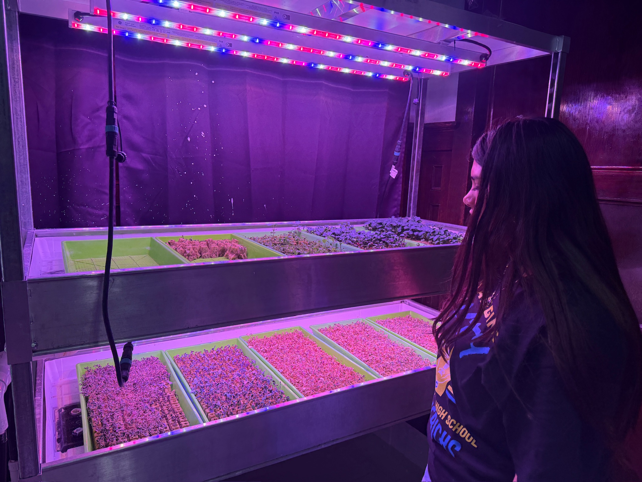 Across the hall, the environmental systems lab glows with the purple light of grow lamps, where students maintain hydroponic systems and test pH levels for crops.