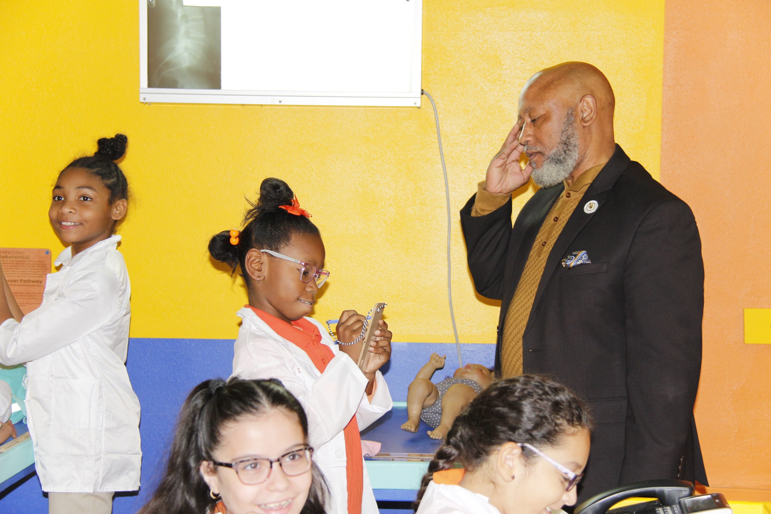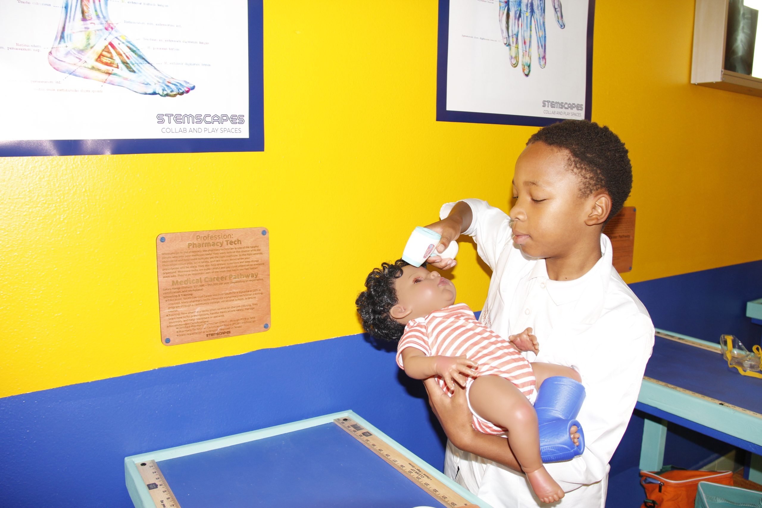 Through a partnership with United to Learn and STEMscapes Collab & Play Spaces, the lab invites students to take on roles such as surgeon, physical therapist, receptionist, and clinic staff.