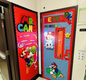 To make the foundational learning process more engaging for his students, Cano decided to transform his classroom into a Super Mario Bros-inspired wonderland.From the door to the wall, each inch of the classroom pays homage to the popular Nintendo game. Covered with red and blue construction paper, the door and wall adjacent to Cano’s classroom feature cutouts of Mario riding Yoshi, a rainbow LED tube light winding from Yoshi’s fist, Mario sitting on an illuminated cloud, and Starman and other characters from the video game. Large, colorful block letters-on both the wall and the door—spell out “Mr. Cano” and “Level PK4.”