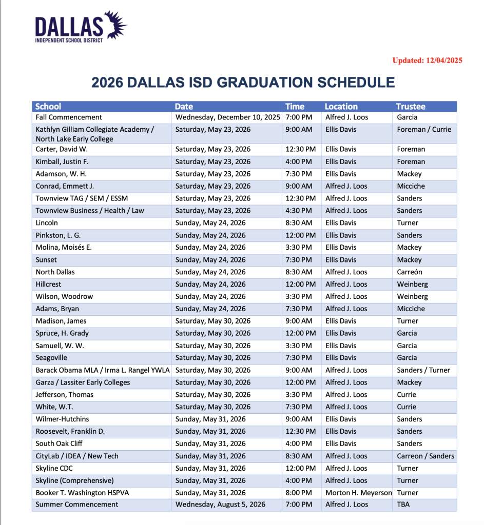 You are at:Home»News»News Briefs»See the Dallas ISD 2026 graduation schedule