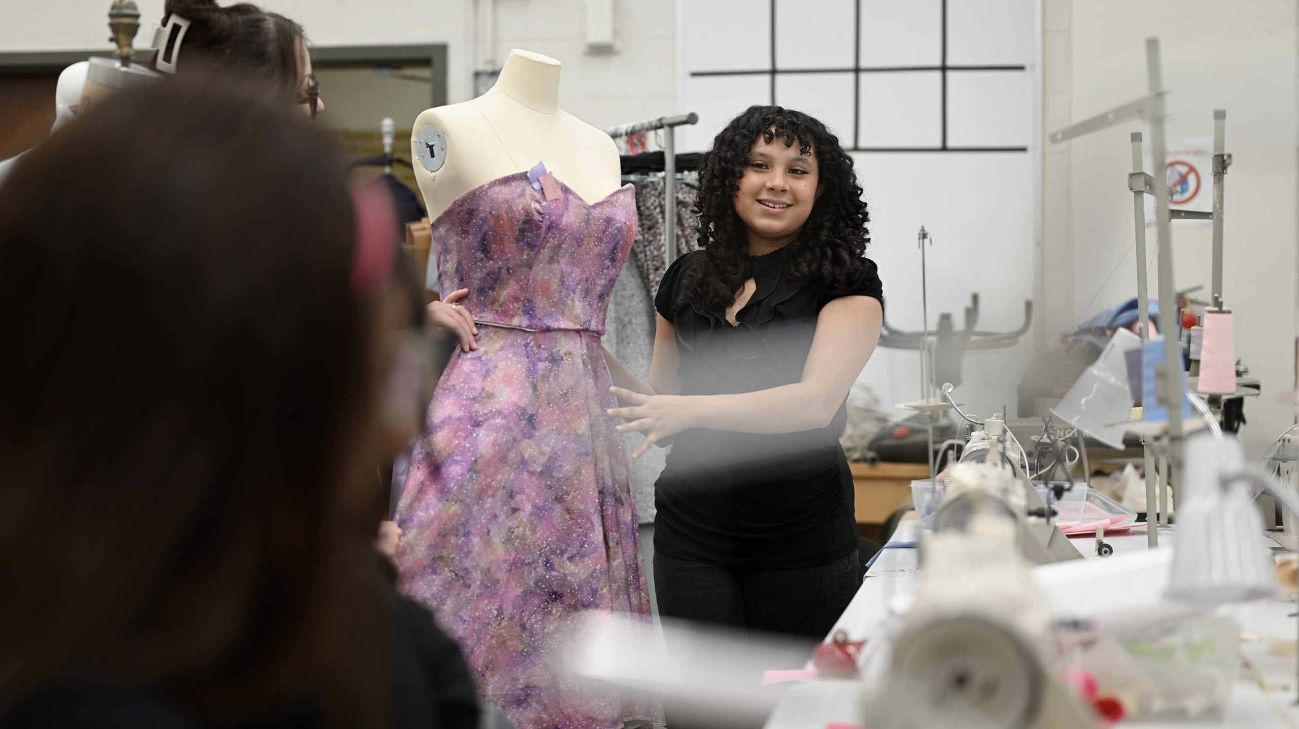 Sewing machines line open worktables and mannequins stand dressed in the latest student designs.
