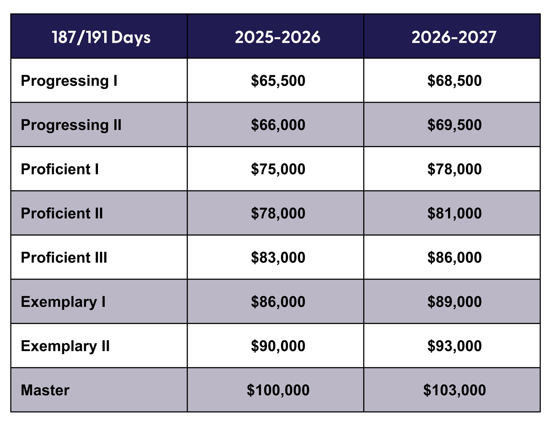 The proposed budget also includes increases for other employees who are evaluated through an excellence initiative—assistant principals, principals, school counselors, and school leadership executive directors. Increases for excellence initiative team members are paid in October 2026 retroactive to contract start date.